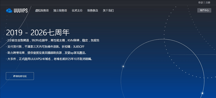 UUUVPS(中文名:三优云)2019年在香港注册,主营VPS及独立服务器租用业务,机房包括美国洛杉矶(AS4837/AS9929)和中国香港(BGP优化)等。美国VPS特别开设跨境电商专区,配备双ISP住宅家宽IP,支持联通CUII/AS9929线路,并有多IP段可选。目前香港VPS可使用8折优惠码,折后月付28元起;美国VPS提供85折优惠,洛杉矶双ISP住宅VPS折后月付35元起。