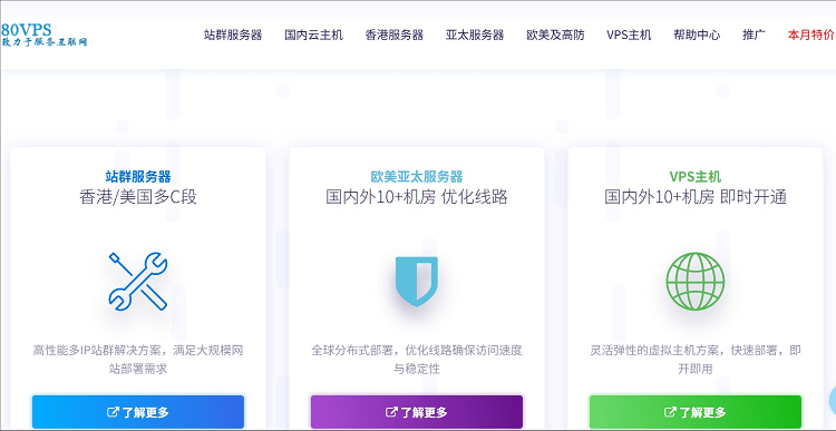 80VPS是南宁悠米网络科技有限公司旗下的老牌国人主机商,自 2011 年成立以来主要面向中文用户提供 VPS、独立服务器及虚拟主机租用。其核心优势在于广泛的海外节点覆盖,机房遍布中国香港、韩国、日本、美国及欧洲等地,主打 CN2 GIA 等优化线路以保障国内访问速度。产品支持 KVM/XEN 架构及 Windows/Linux 系统,配备 SolusVM 等中文控制面板,并提供 7×24 小时工单支持。作为典型的“国人商家”,它支持支付宝、微信等本土支付方式,定价走中低端性价比路线,适合外贸建站、SEO 站群及个人开发者,但需注意部分低价套餐在流量高峰可能存在网络波动。